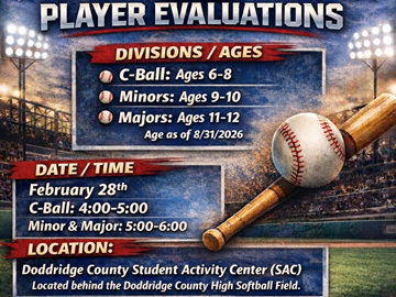 Player Evaluations will include the C-Ball Division this year as well. Their time slot is different than the Minor and Major Division. Please make sure you arrive during your division's scheduled time.